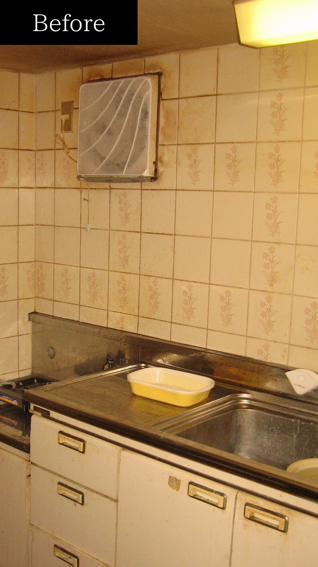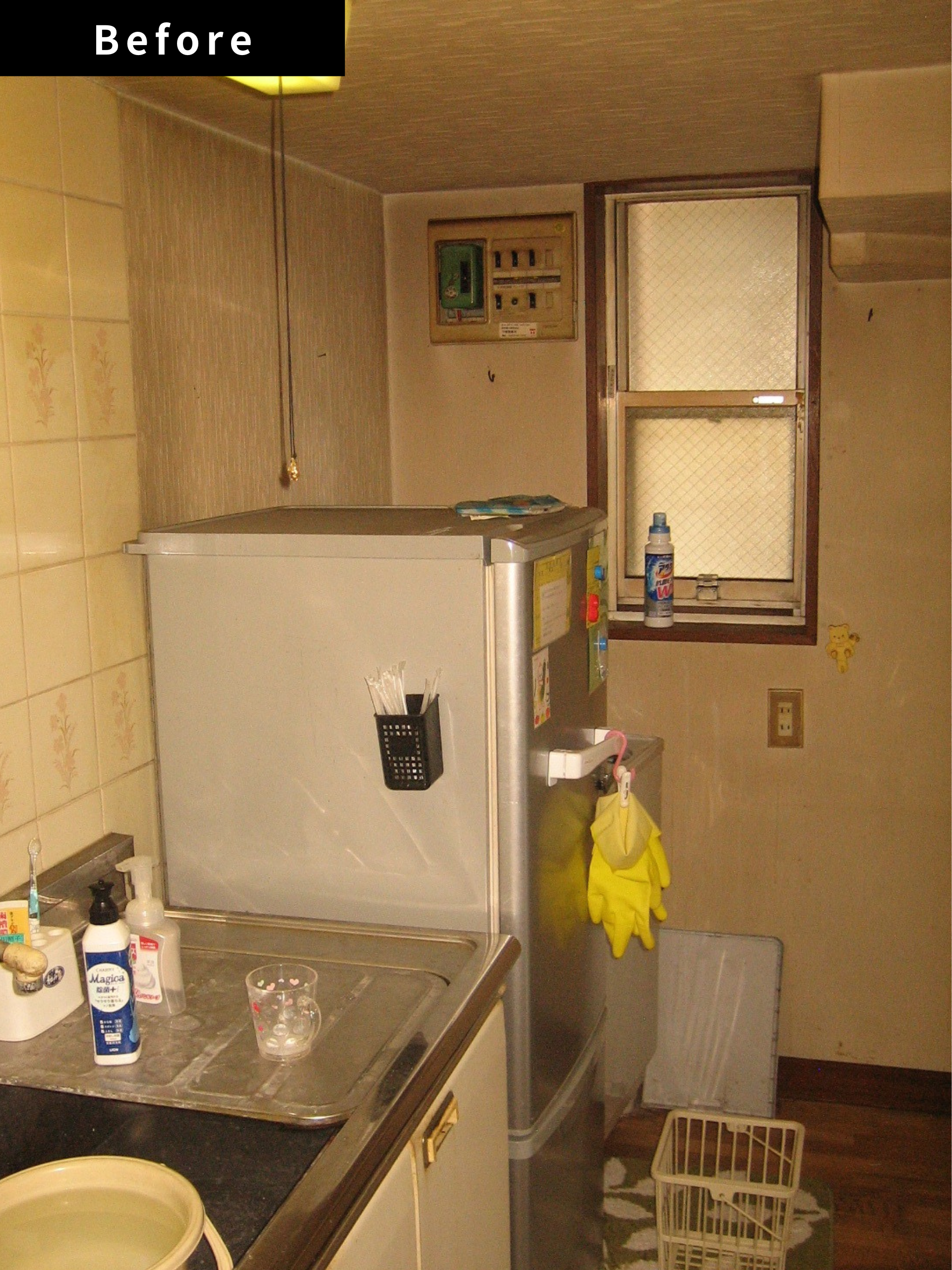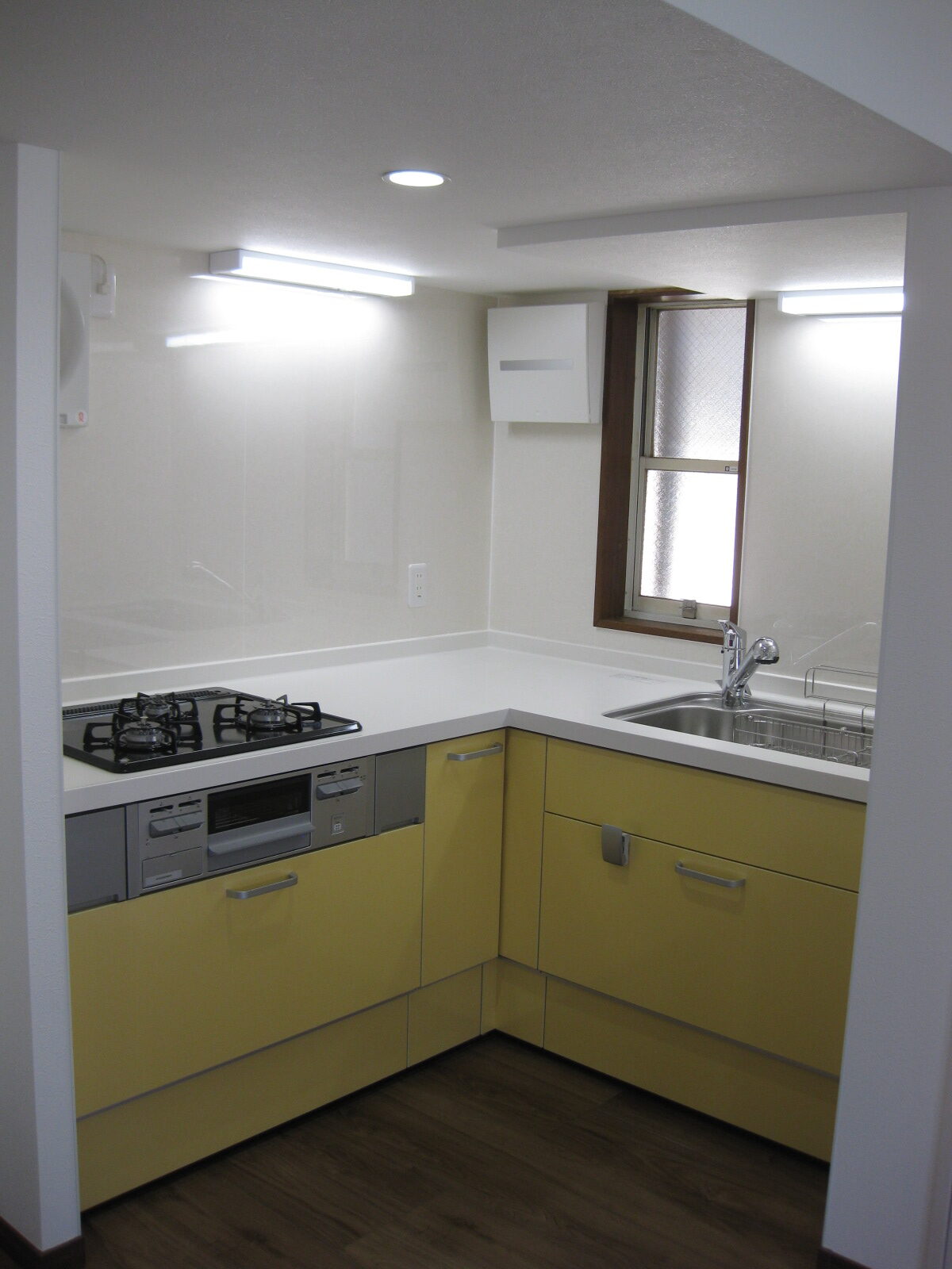 キッチンと家電スペースの配置を入れ替え、階段下にL字キッチンを設置することでデッドスペースを有効活用。ホワイトの壁パネルで空間に広がりを持たせつつ、イエローのキッチンが明るく心地よい印象を演出しています。
